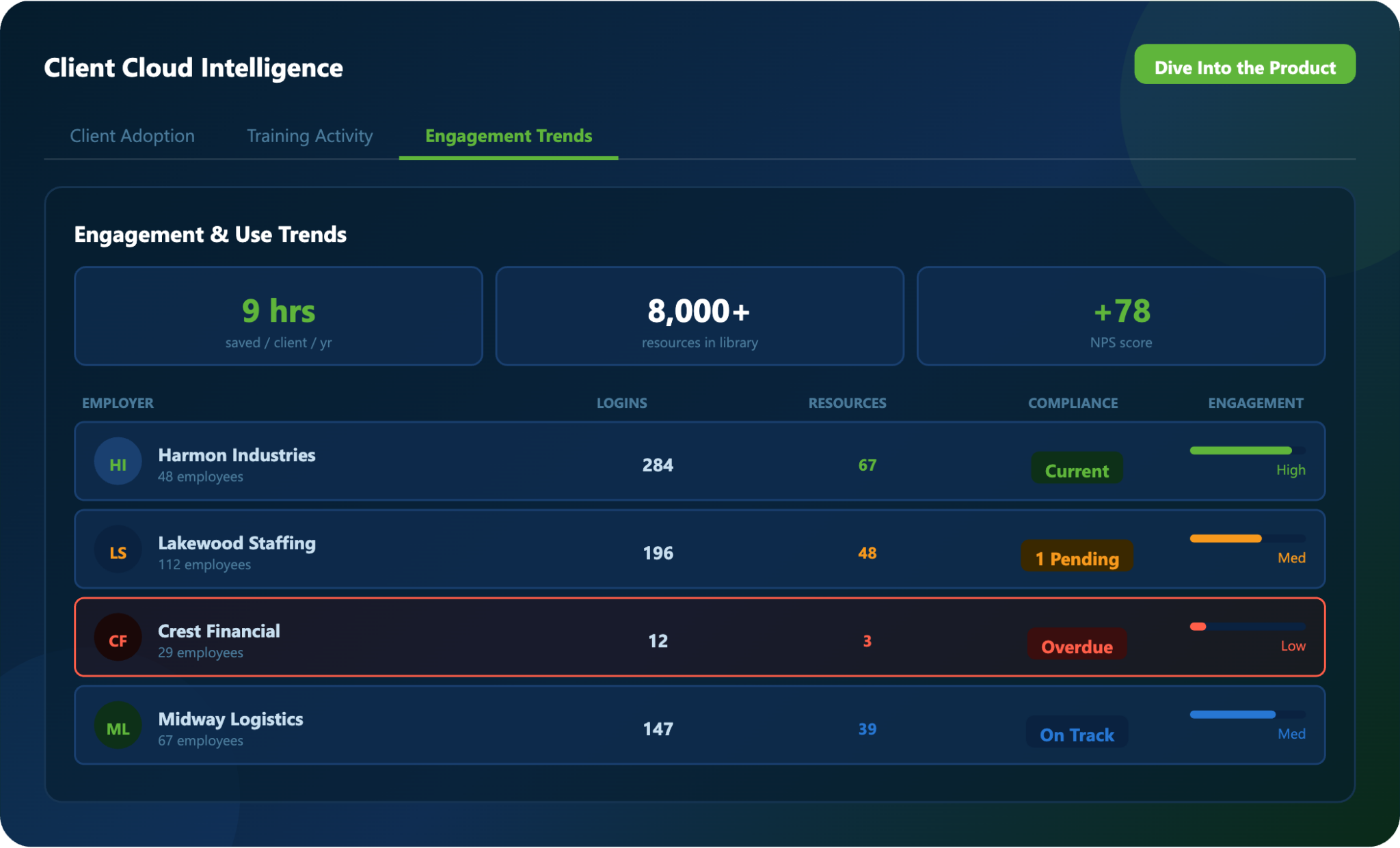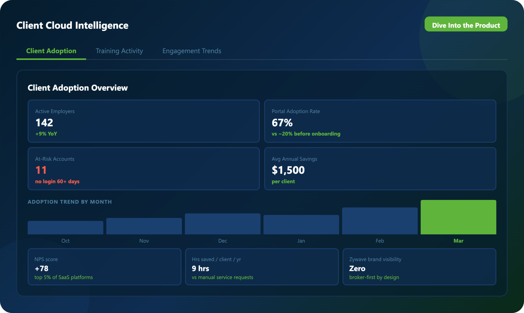 View which employer clients are actively using Client Cloud, how adoption trends over time, and where engagement may need reinforcement. Identify at-risk or disengaged accounts before they become retention problems — and arm producers with a specific action for every account review.