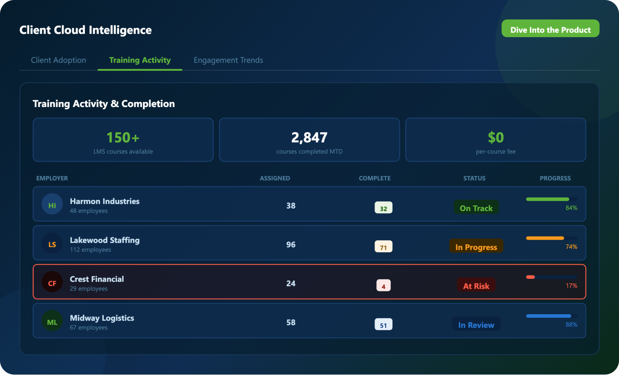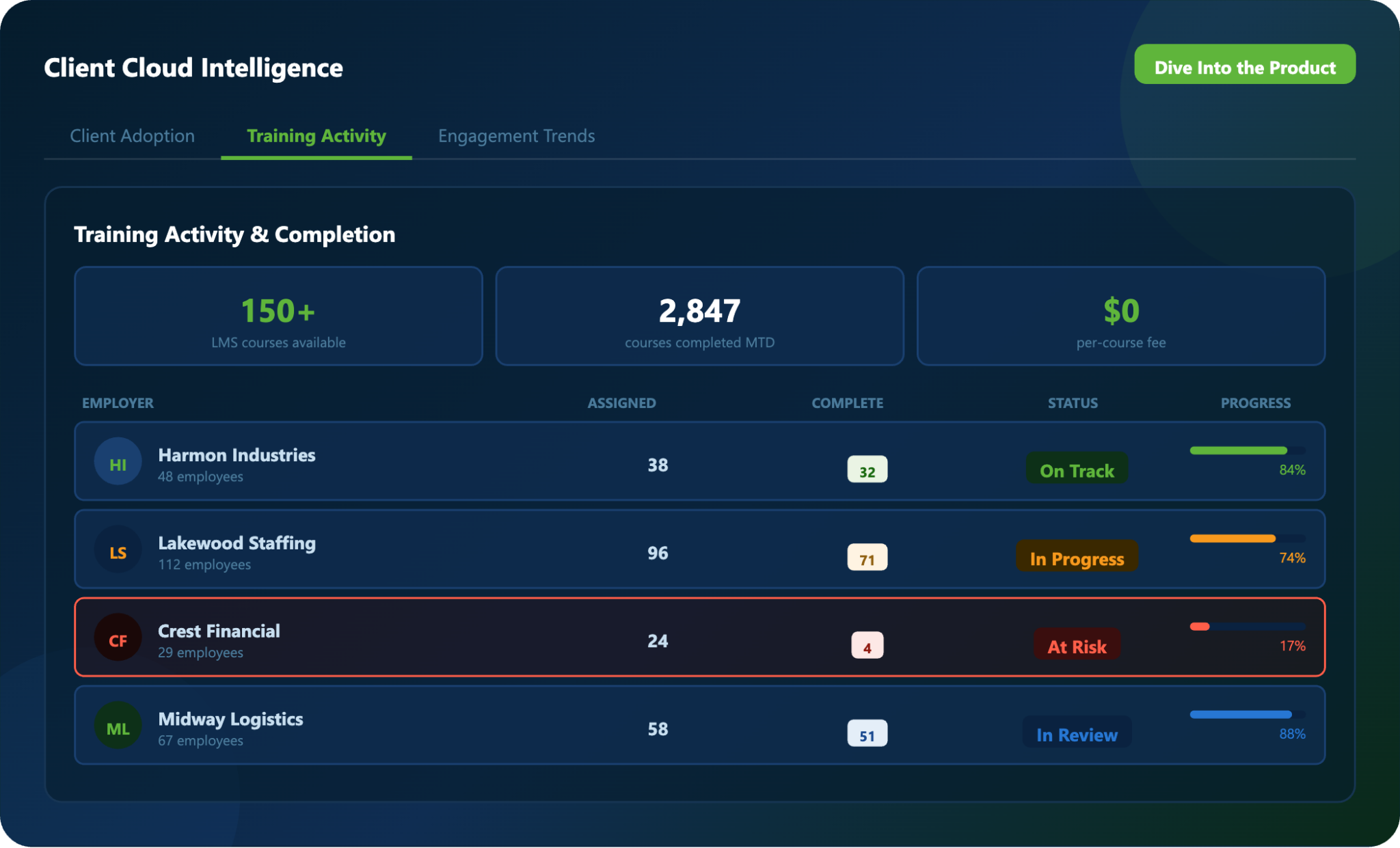 Monitor how employer clients interact with your portal, track training and compliance progress, and demonstrate measurable value — from a single, unified dashboard.