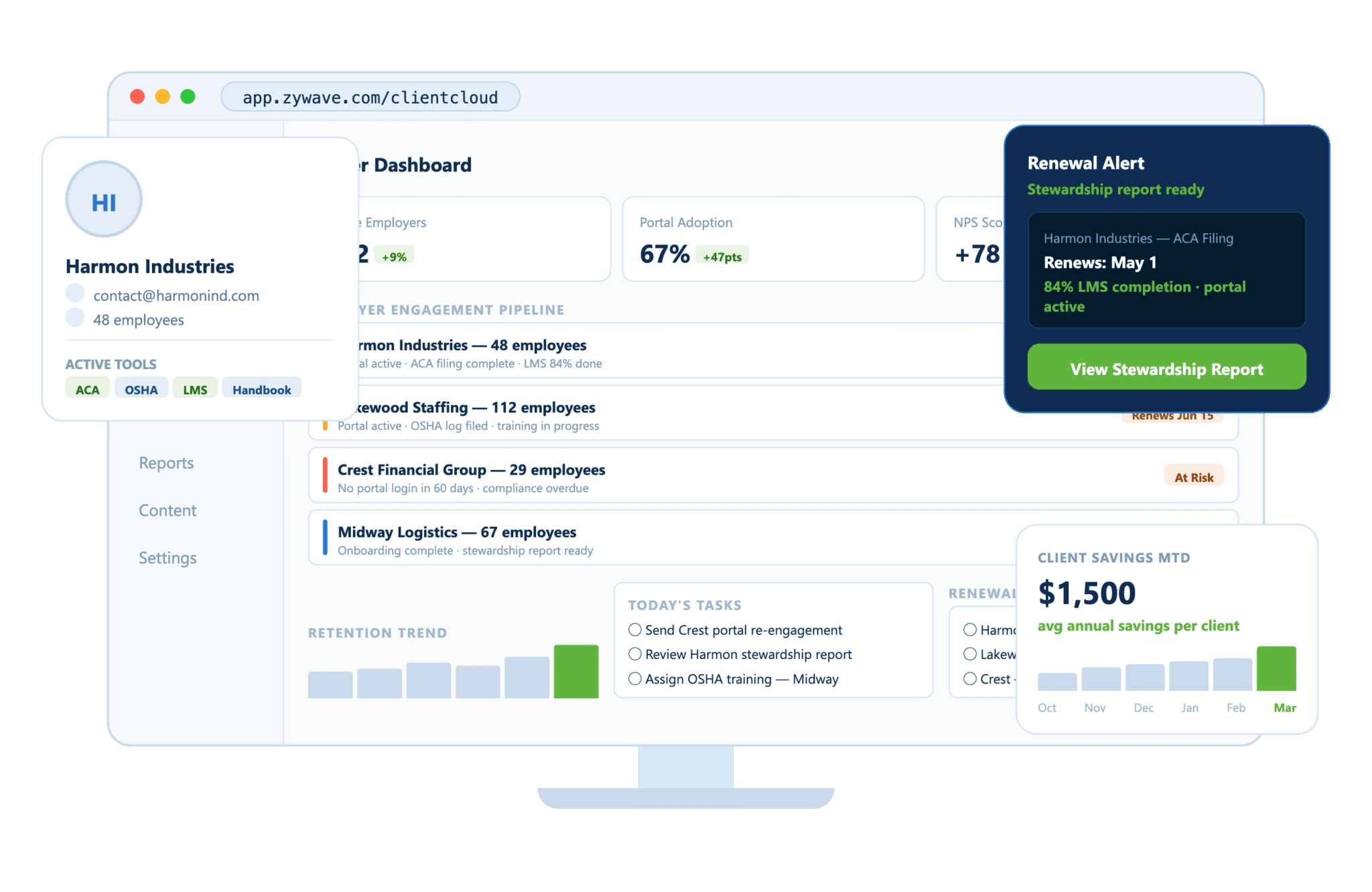 See how frequently clients interact with compliance tools, HR resources, and portal features — and translate that engagement data into a concrete value story. Stewardship reports pull from this dashboard automatically, giving producers a compelling, data-backed renewal conversation every time.