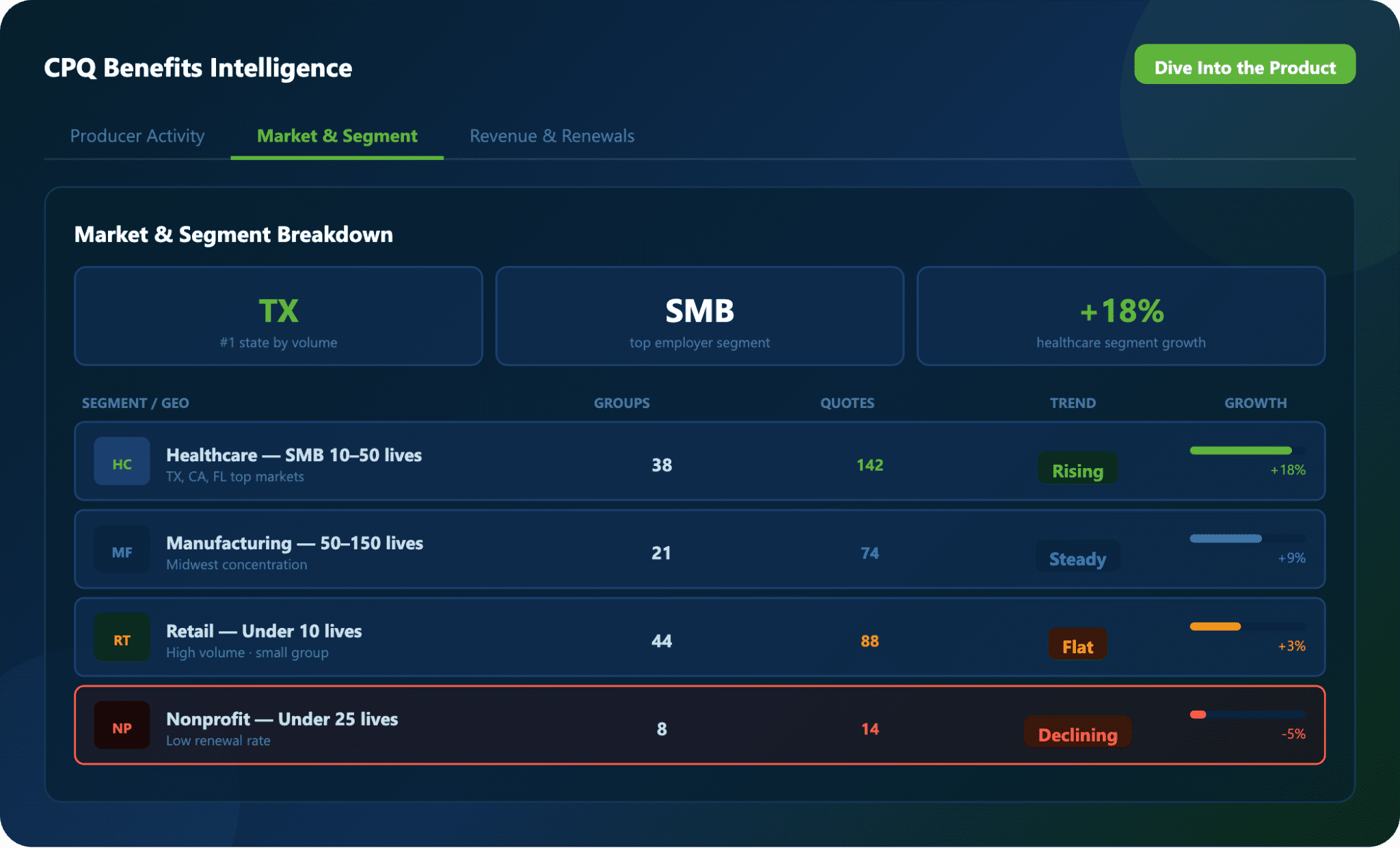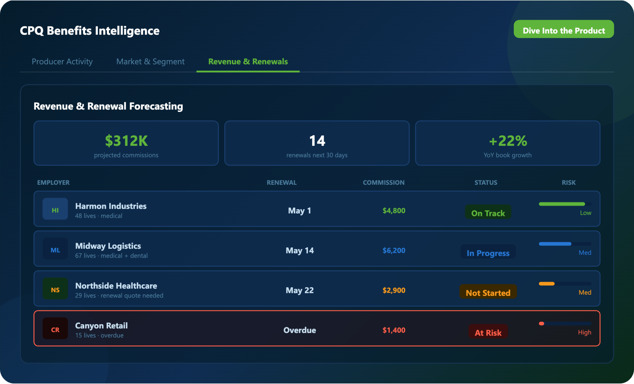 Use real-time dashboards to monitor pipeline activity, renewal timing, and growth performance across your employee benefits book.