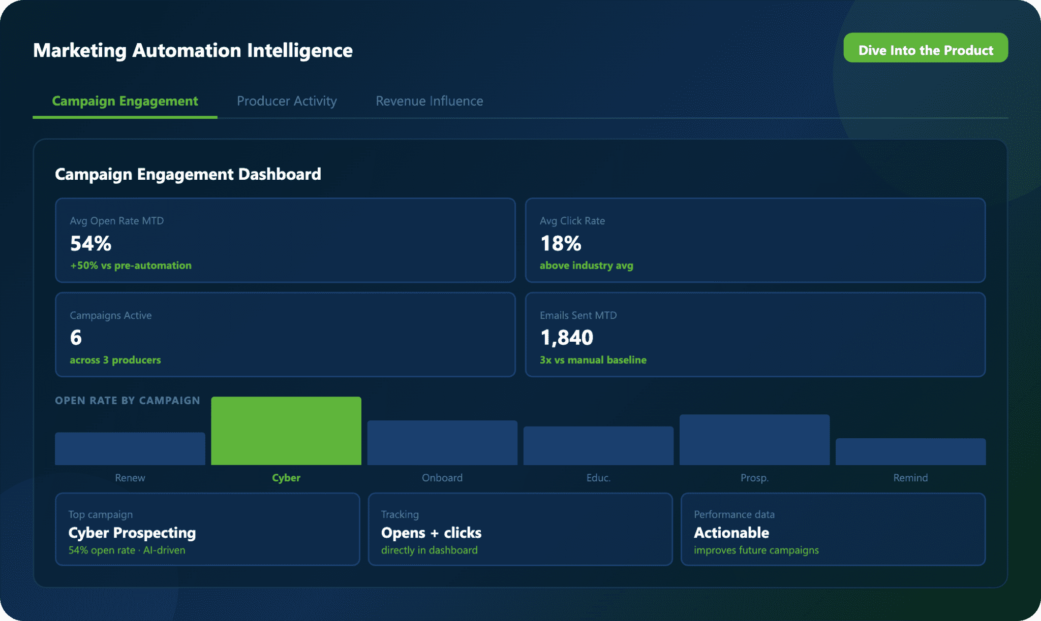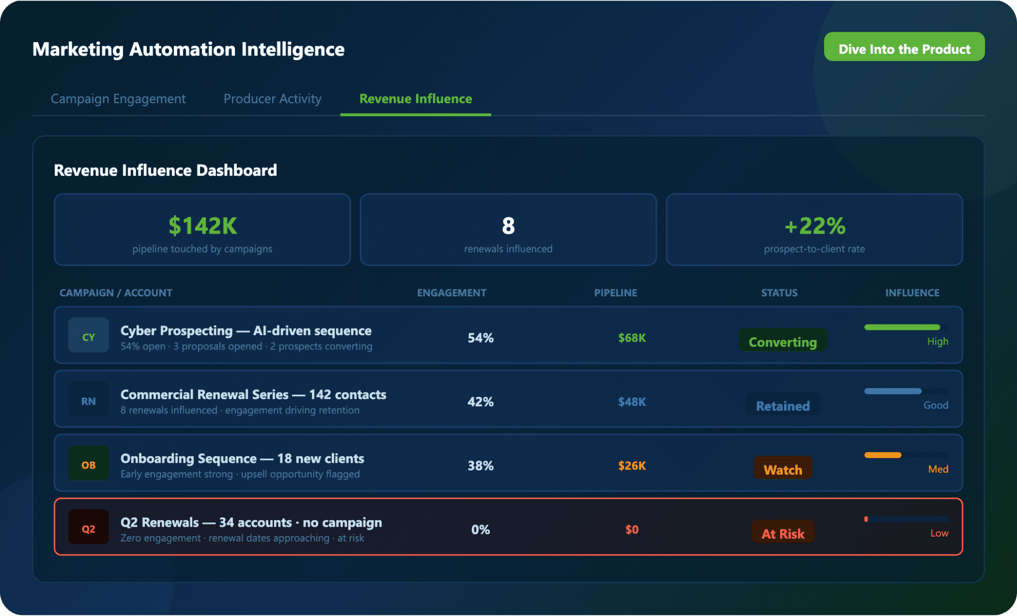 Connect campaign engagement data to renewals, prospect activity, and pipeline movement.