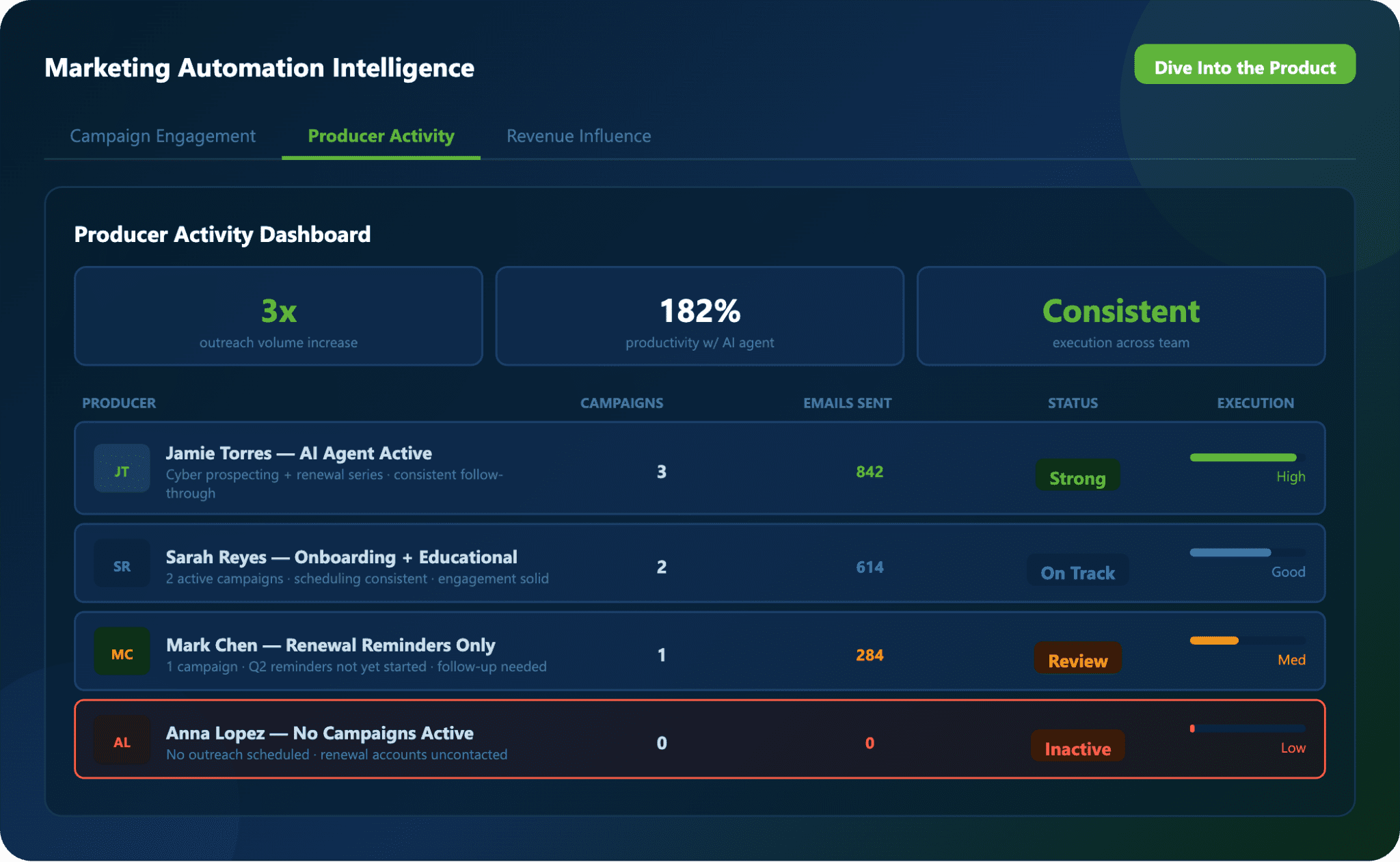 Monitor outreach activity by producer to ensure consistent execution and follow-through.