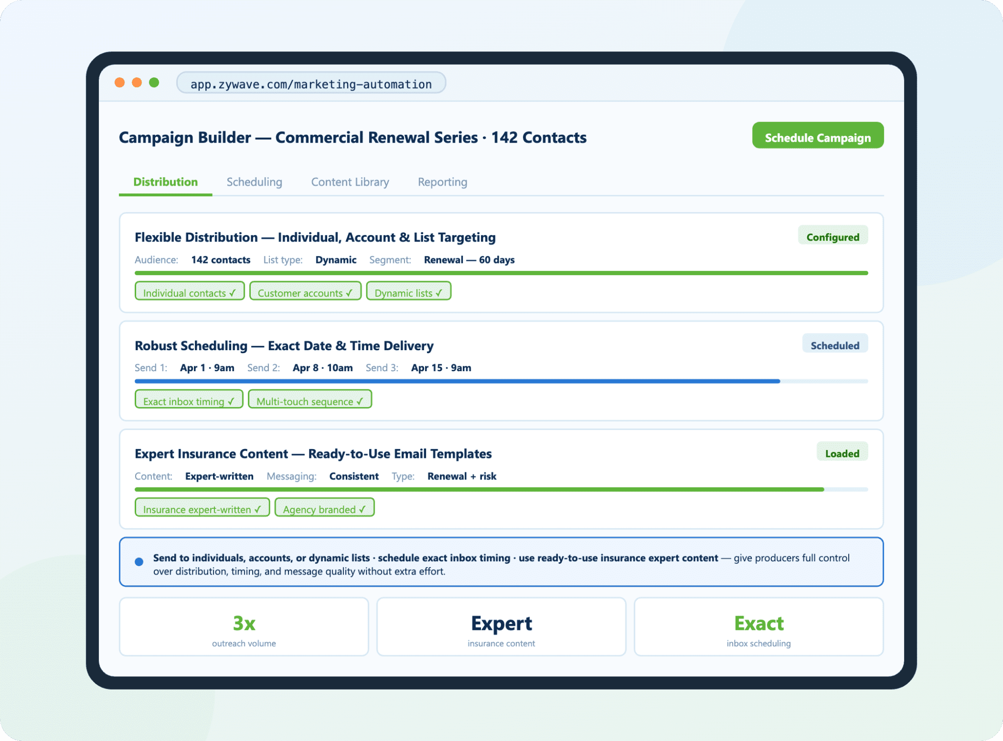 Zywave insurance marketing automation is software that helps agencies plan, send, and track marketing messages automatically. Instead of sending messages manually, producers can schedule campaigns and manage outreach from one platform.