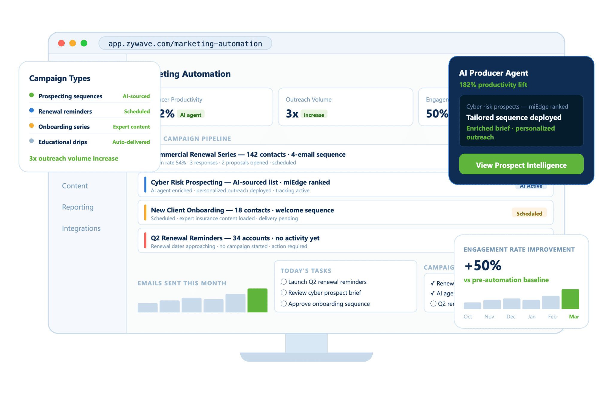 Eliminate 15+ step manual processes and see a 182% improvement in Marketing Automation productivity with Zywave's AI Producer Agent.