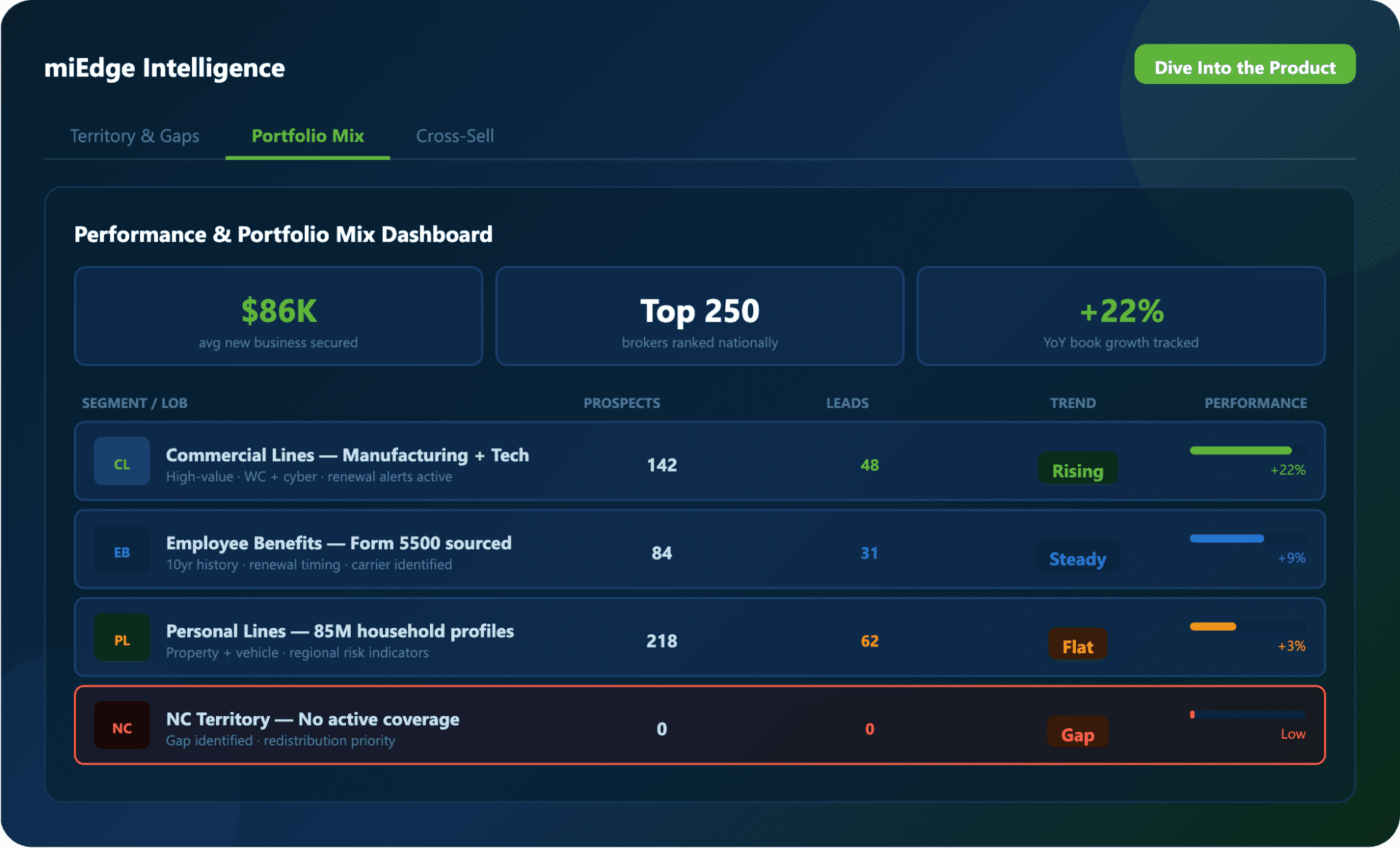 Yes. miEdge is built for both. Insurers use it to evaluate distribution patterns, identify broker appointment opportunities, and expand into new geographies and lines of business. Brokers and agencies use it to build lead lists, prospect smarter, and go deeper with existing clients.