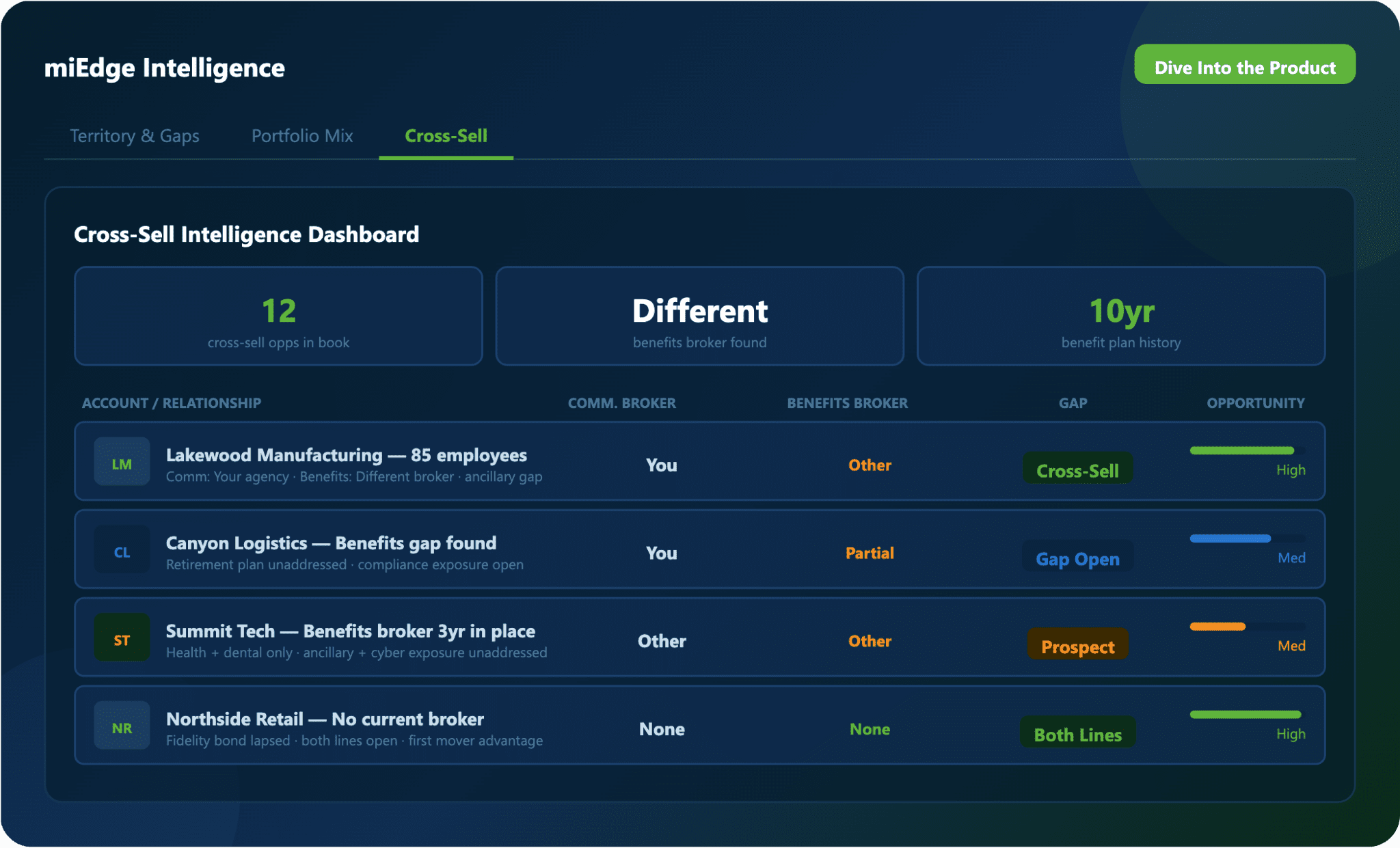 The agencies growing fastest aren't just winning new clients — they're going deeper with the ones they already have. If you write commercial lines, chances are some of your best clients have a benefits broker you've never met. miEdge shows you who that is — what they're earning, what carriers they placed, and whether there's a gap worth pursuing.
