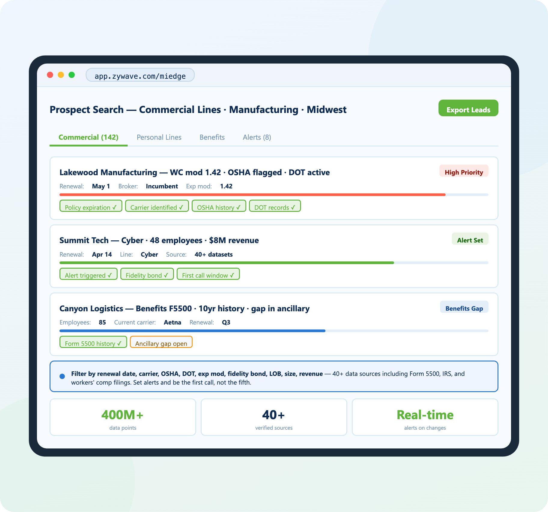 Search 85M+ households and 4M+ employer profiles — powered by 40+ data sources including Form 5500 filings, DOT records, OSHA data, workers' comp filings, IRS data, and many other proprietary sources. That's not a list. That's a market map built specifically for insurance.