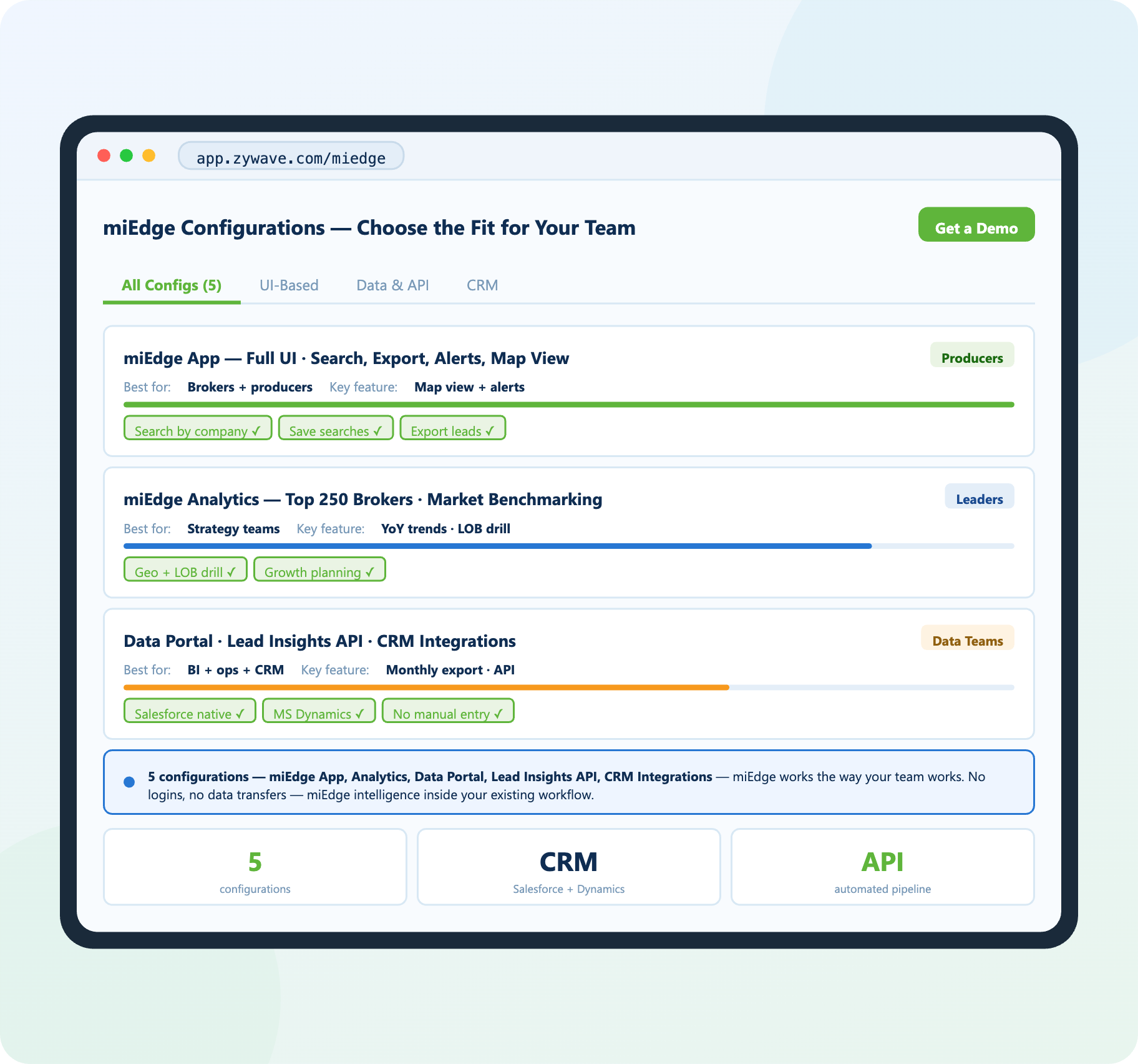 The right configuration depends on your core needs. Teams that want a hands-on prospecting UI use the miEdge App. Strategy and leadership teams who need market-level visibility use miEdge Analytics. Data teams that need structured exports use the Data Portal. Teams that want miEdge intelligence inside their own platforms use the Lead Insights API or CRM Integrations.