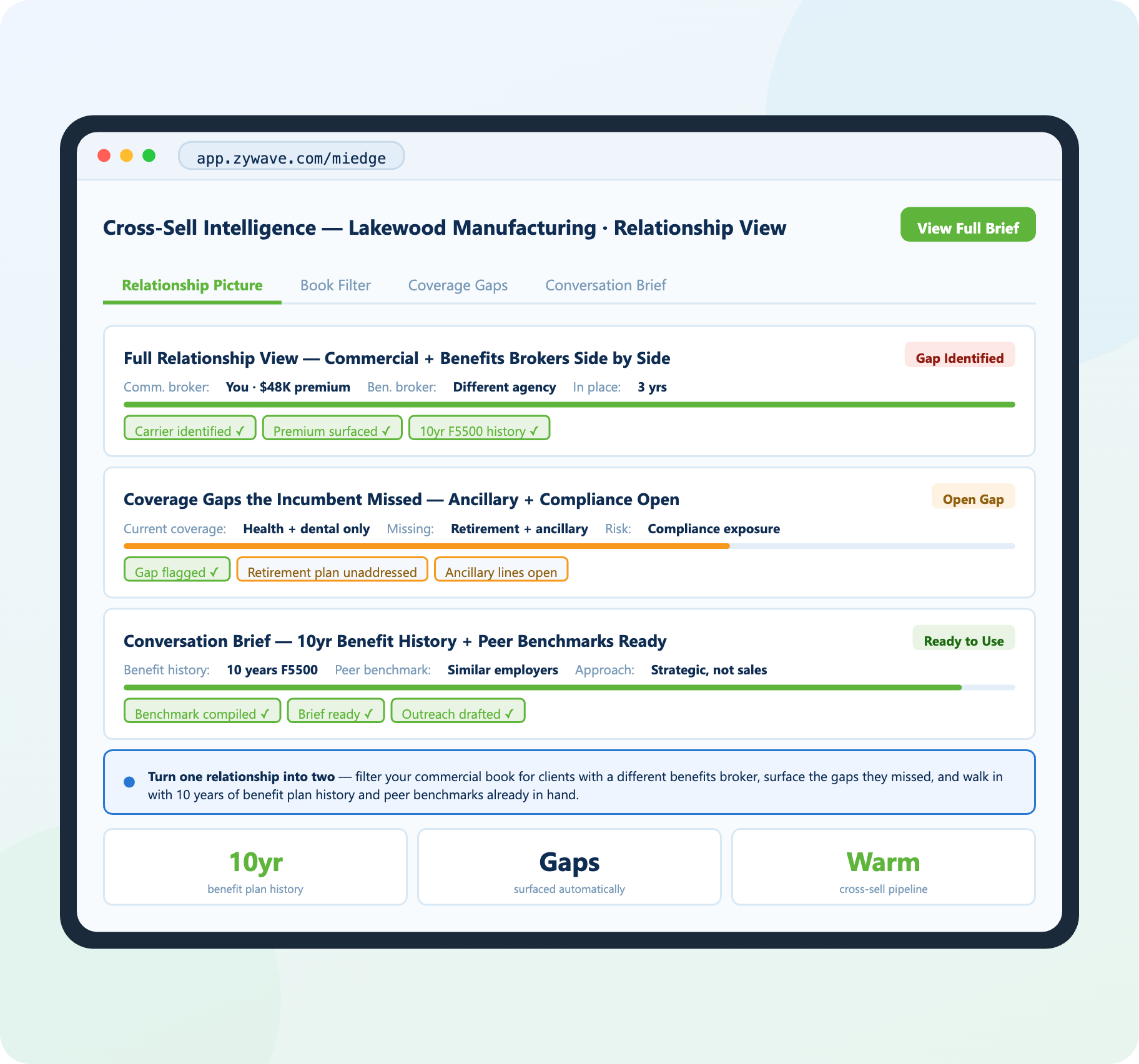 If the benefits broker on an account only covers health and dental but the employer has a retirement plan, ancillary lines, or compliance exposure going unaddressed — that's your opening. miEdge surfaces those gaps so you can walk in as the advisor who caught what the other broker didn't.