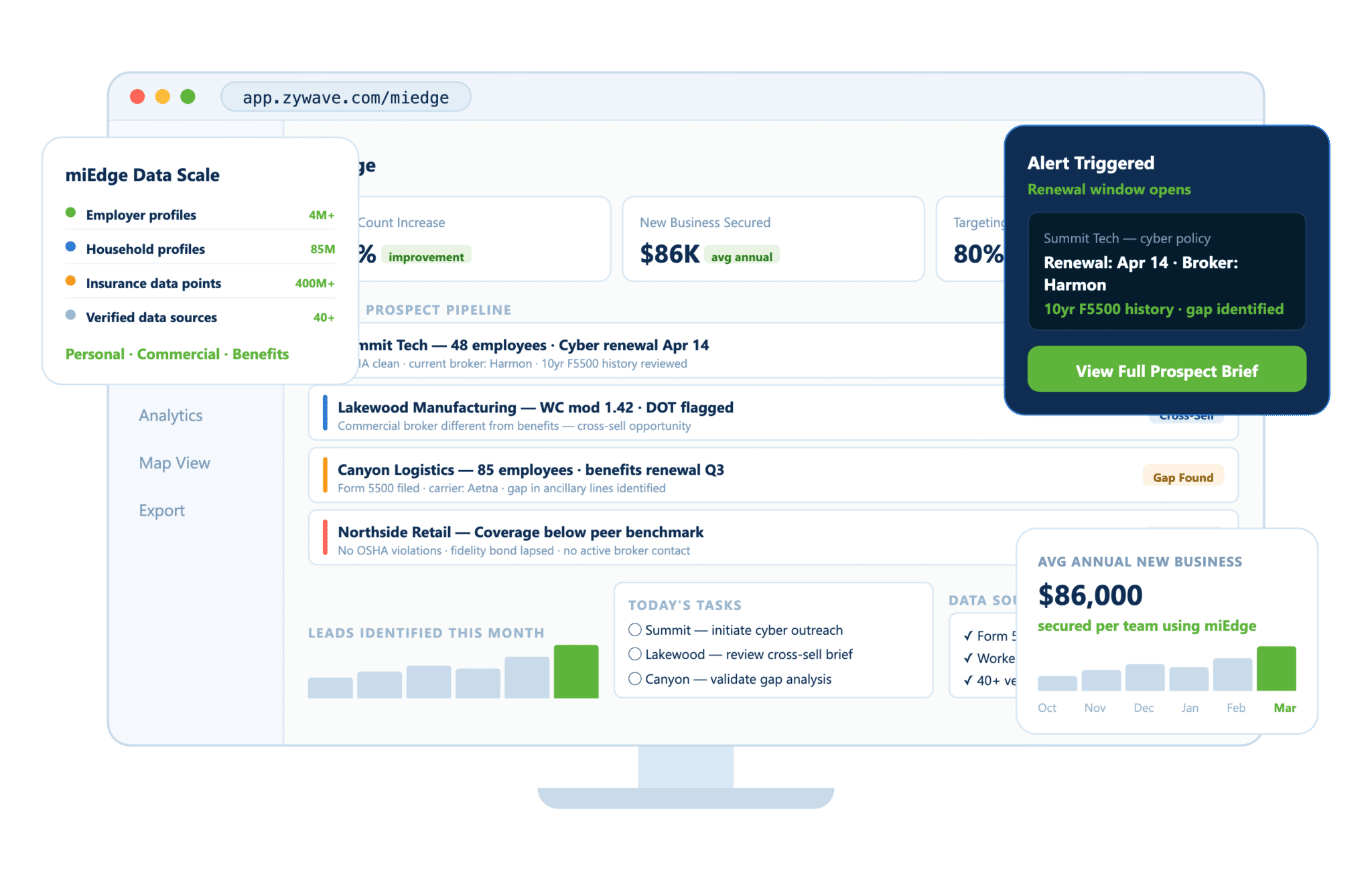 miEdge is the only prospecting platform built specifically for insurance - combining data records from 40+ sources into verified profiles on 4M+ employers and 85M households, so you can find better leads, reach them at the right moment, and walk into every conversation prepared.