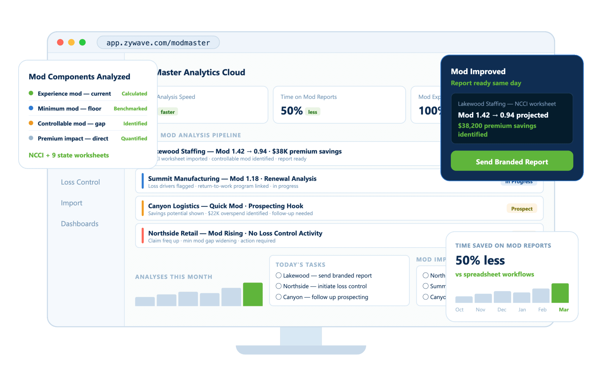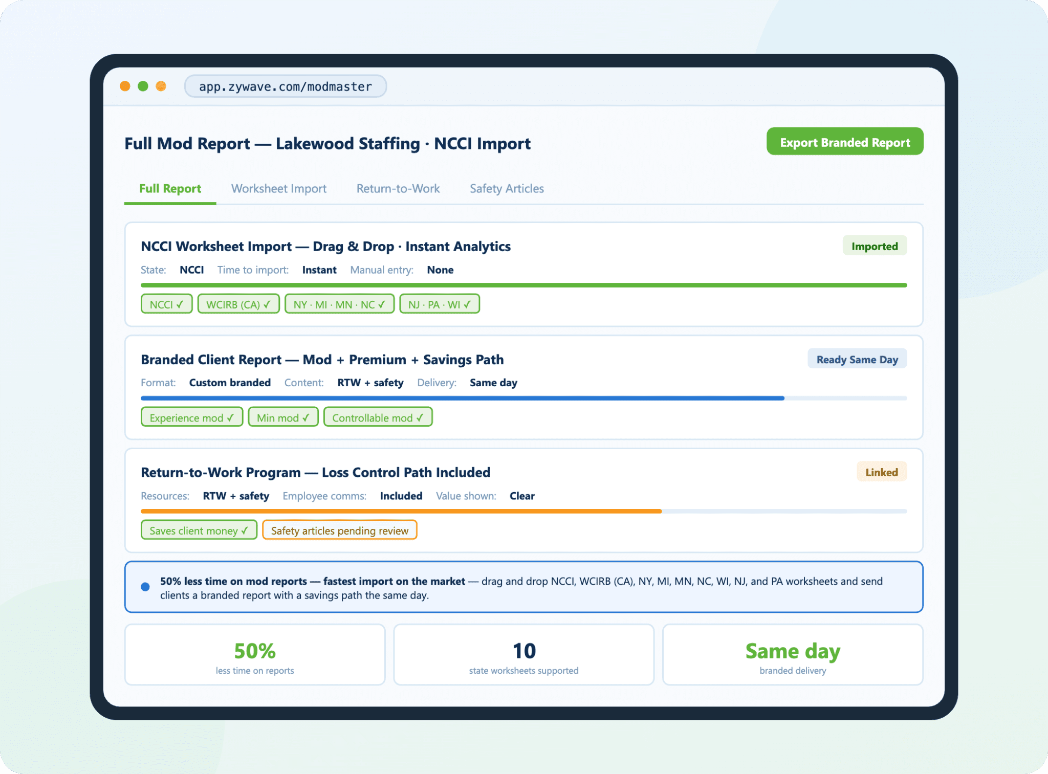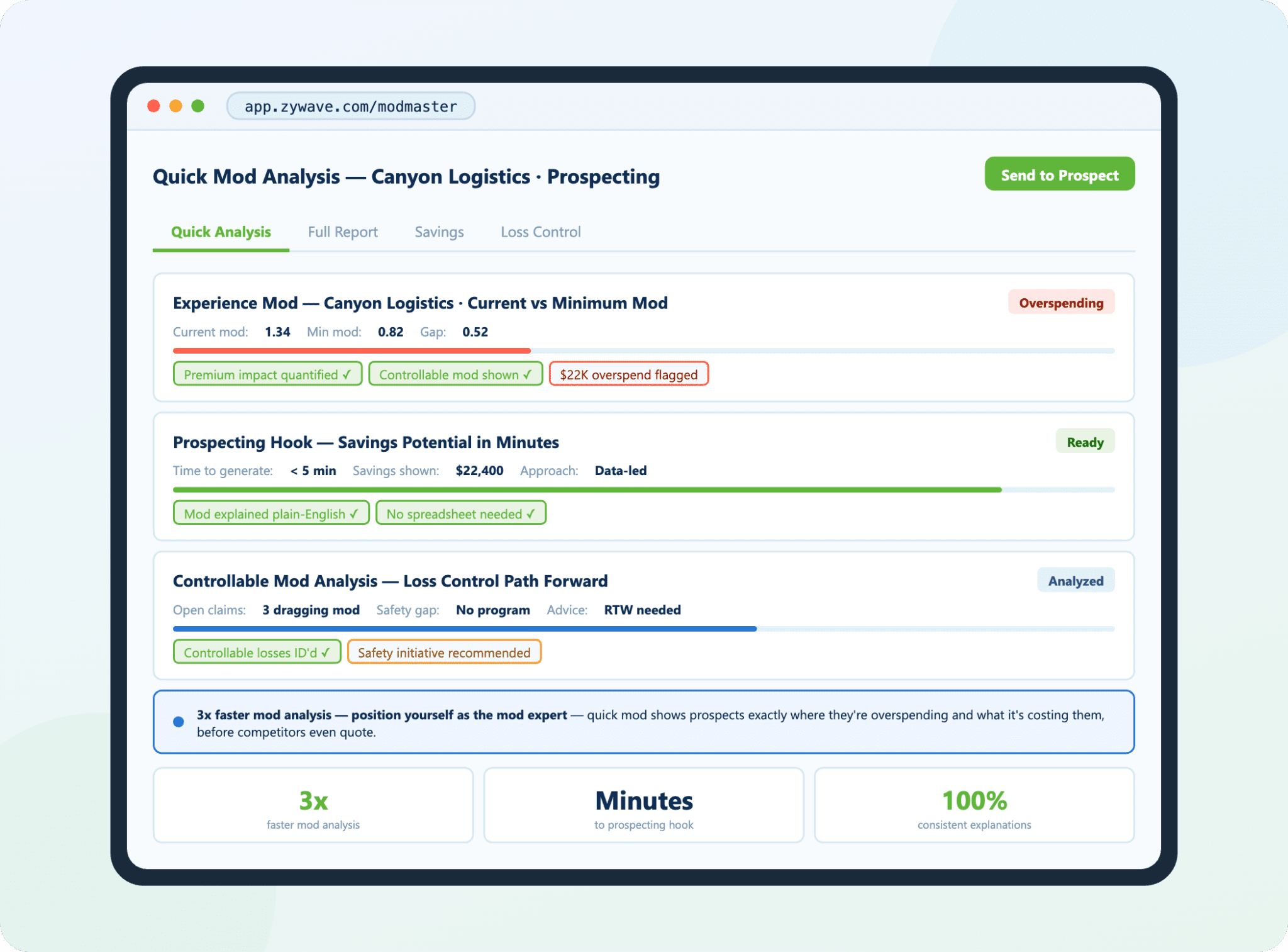 ModMaster includes Quick Mod Analysis, which allows users to estimate savings potential in minutes. This creates a strong prospecting hook and helps educate buyers on how mod performance affects workers’ compensation costs.