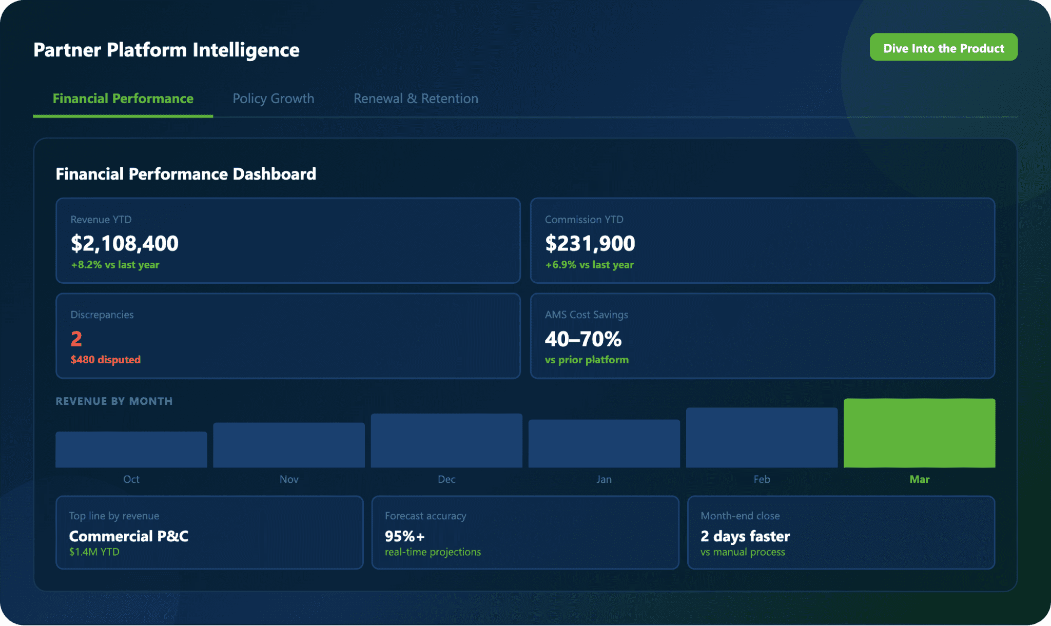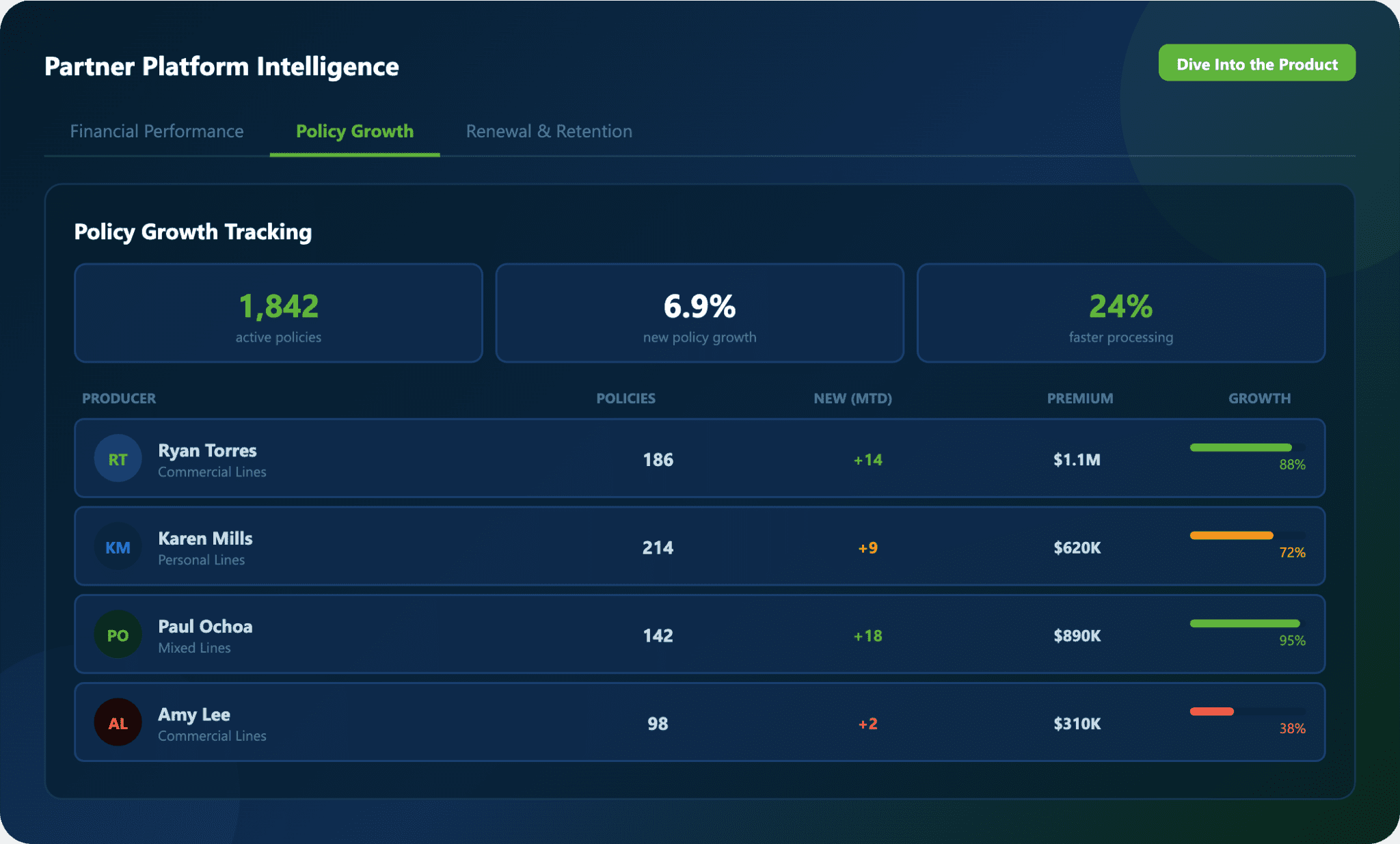 Yes. Partner Platform provides real-time access to financial, retention, and policy activity reporting. Agencies can monitor performance, track growth, and review operational data with revenue forecasting accuracy up to 95% — no advanced technical skills required.