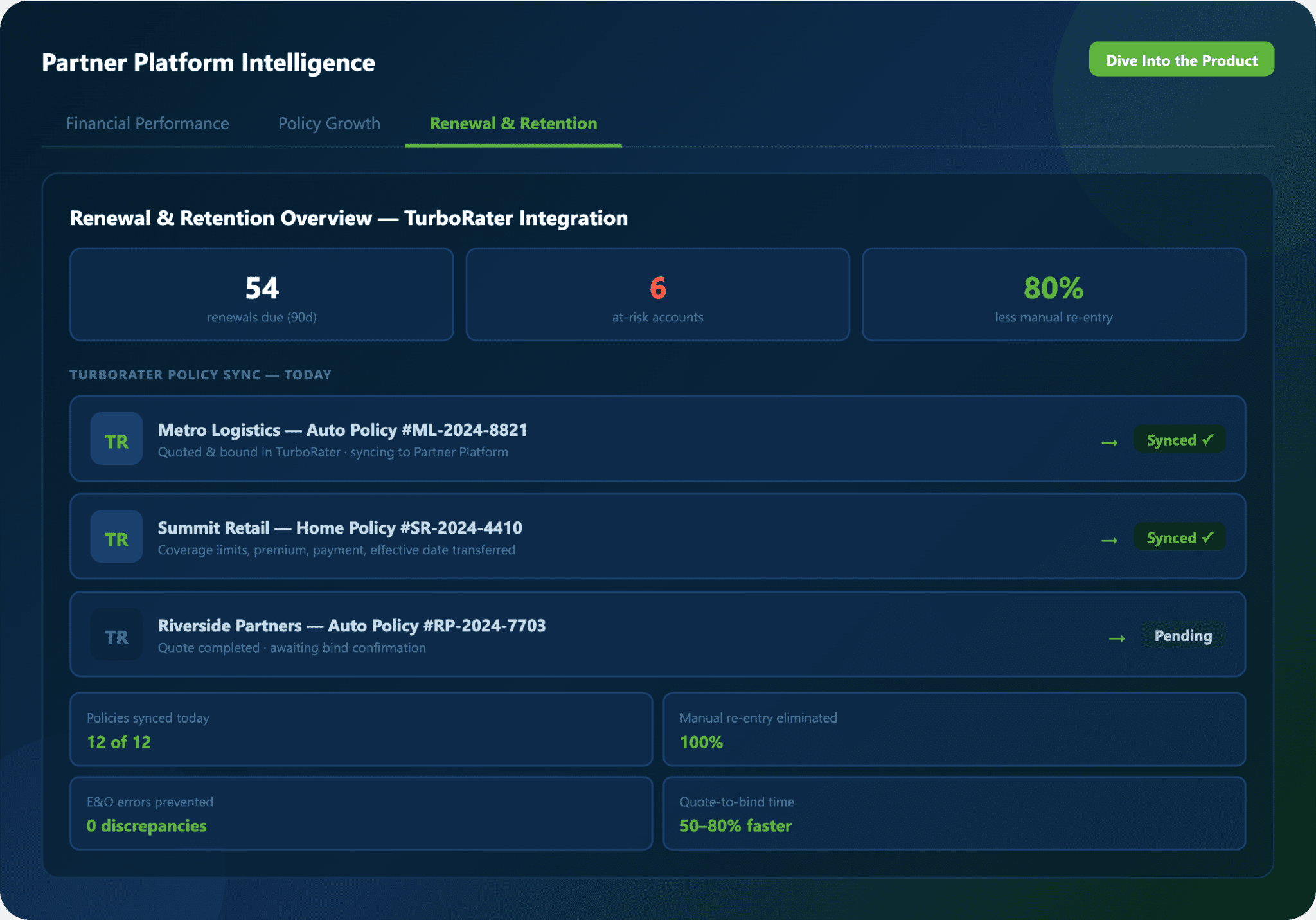 A direct two-way integration connects Partner Platform with TurboRater. When a personal lines policy is quoted and bound in TurboRater, the complete policy details automatically transfer into Partner Platform — no manual re-entry required, no data gaps.