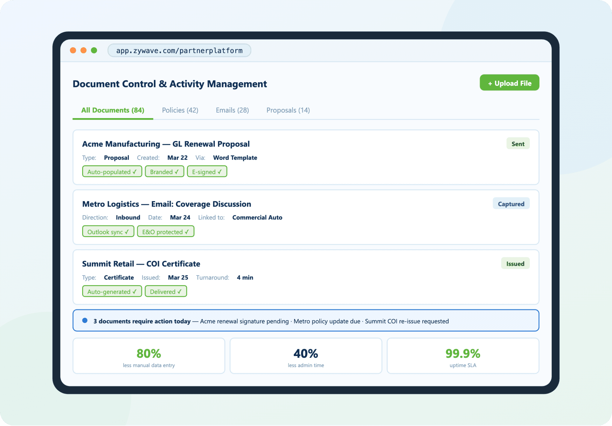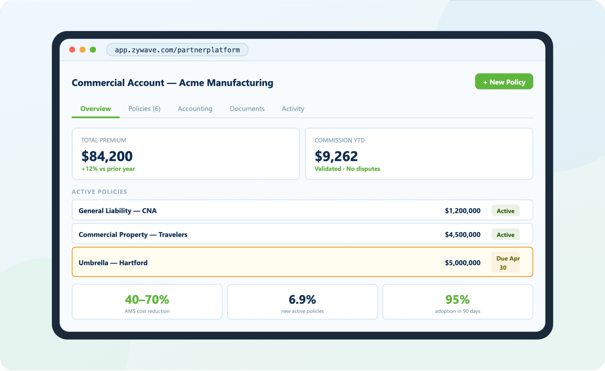 By centralizing policy details, client information, documents, and financial data in one system, Partner Platform helps teams manage complex commercial accounts with greater clarity and control — reducing manual touchpoints and improving response times across every account interaction.