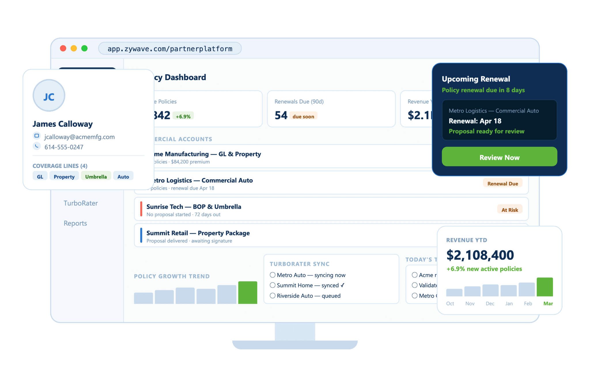 Go from quote to bound policy in minutes while coverage, client, and premium data sync automatically in the background. Producers spend less time on administration and more time writing new business — TurboRater and AMS workflows cut quoting and service time by 50–80%.