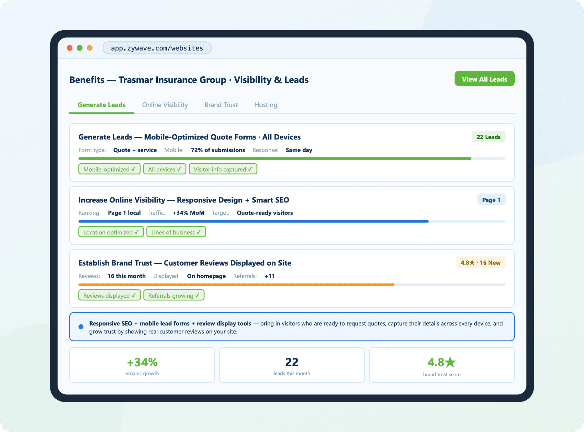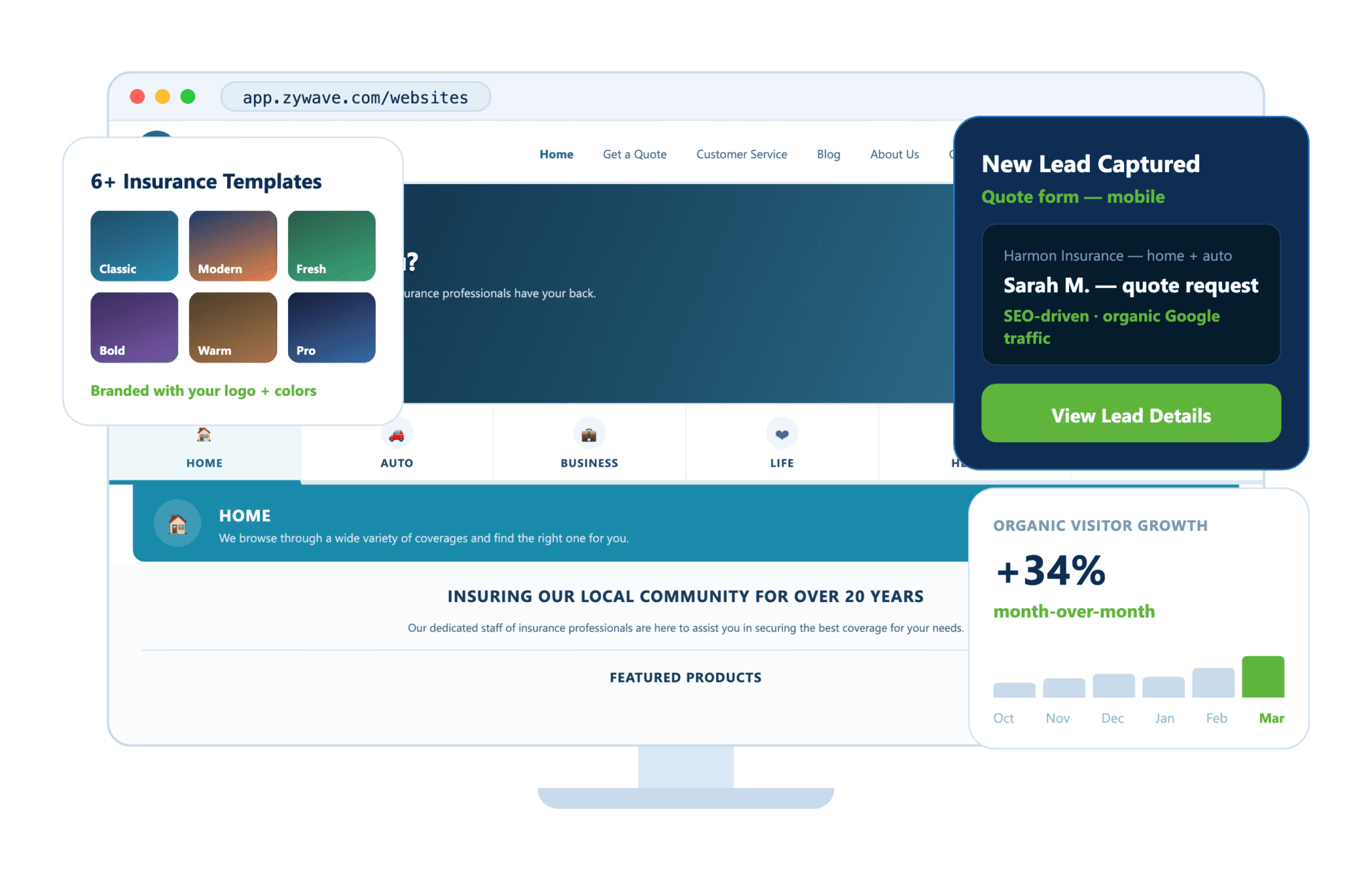 Zywave provides professional website solutions for independent agencies. Each site is created to help you compete online, attract the right traffic, and turn visitors into clients through thoughtful layouts and built-in lead tools.